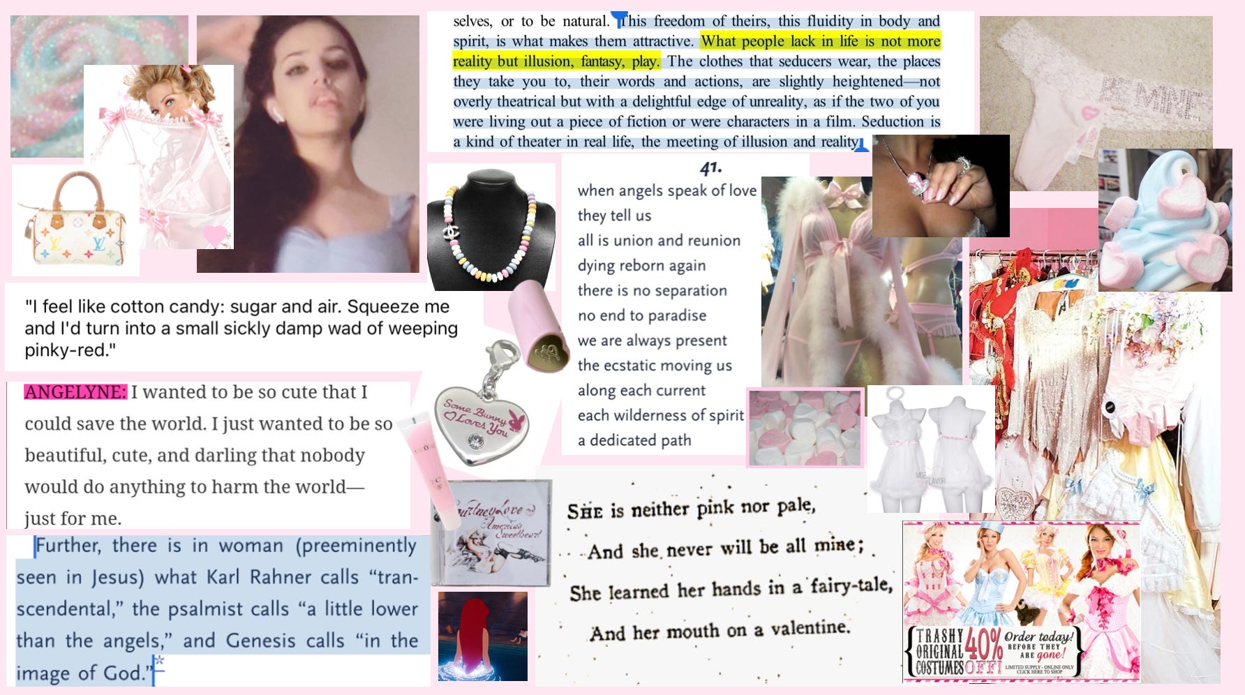 I’m made of: Disney Princesses (Ariel + Cinderella to be precise), sexy angel/nurse costumes, Haifa Wehbe lying about being 20-something when she was actually 35, black eyeliner pencil, expensive things from the early 2000s, TRUE AND REAL love, melodies from God, Park Towers, cotton candy and the smell of it, Bridget Marquardt’s dispassionate birthday cake strip tease for Hugh Hefner’s 80th birthday, Courtney Love’s America’s Sweetheart record, (get it? Because everyone hated her; it was a commercial failure), derelict office blocks with red and blue gelatinous lights inside, when Elliott smith sang ‘cuz everyone is a fucking pro and they’ve all got answers from trouble they’ve known and they all gotta say what you should and shouldn’t do, though they don’t have a clue’, an insatiable lust for calm danger, and a lot of other things that you may or may not understand and that I cannot remember at this time.